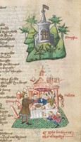 Londra, British Library, Harley 1766, f. 88v. Canace giace nella tenda con il fratello Macareo; Canace riceve da un messo la spada mandatale da suo padre.