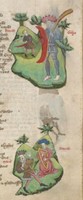 Londra, British Library, Harley 1766, f. 69r. Ercole decapita Caco per aver rubato parte dei buoi di Gerione; Ercole, dopo aver decapitato il drago Ladone a guardia del giardino, ruba i pomi d'oro delle Esperidi.