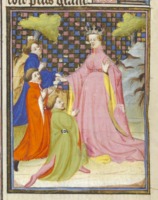 Bruxelles, Koninklijke Bibliotheek van België, 9509, f. 16v. La dea Venere riceve le lodi dei suoi ammiratori.