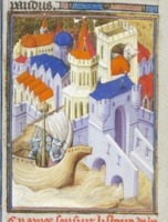 Bruxelles, Koninklijke Bibliotheek van België, 9509, f. 49v. Paride si avvicina in nave alla città di Sparta, dove si trova Elena all'interno di un palazzo.
