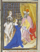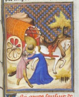 Bruxelles, Koninklijke Bibliotheek van België, 9509, f. 96r. La vestale Claudia impedisce che suo padre venga gettato giù dal carro trionfale.