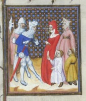 Bruxelles, Koninklijke Bibliotheek van België, 9509, f. 83r. Veturia, accompagnata dalla nuora Volumnia con i due figli, dissuade il figlio Coriolano dal distruggere Roma.
