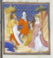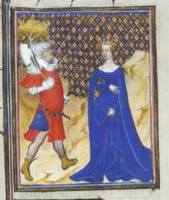 Bruxelles, Koninklijke Bibliotheek van België, 9509, f. 66v. La regina di Saba Nicaula, accompagnata da un uomo e una donna, offre al re Salomone un ramo di balsamino.