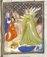 Bruxelles, Koninklijke Bibliotheek van België, 9509, f. 77v. Atalia, regina di Gerusalemme, ordina il massacro di tutti i discendenti maschi della stirpe di David; Atalia viene lapidata da due uomini.