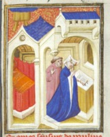 Bruxelles, Koninklijke Bibliotheek van België, 9509, f. 137r. Paolina, raccolta in preghiera dinanzi a un altare, viene corteggiata dal sacerdote Mondo.