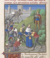 Londra, British Library, Harley 621, f. 274r. Ottaviano ordina l'uccisione di Marco Antonio, catturato mentre cerca riparo presso una statua di Giulio Cesare; Cassio Parmense viene ucciso mentre prega in un tempio dinanzi un'altra statua di Cesare; Giulia viene esiliata dalla città; due uomini armati avanzano verso Agrippa, figlio di Giulia, la quale giace ebbra in un prato.