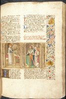Londra, British Library, Harley 621, f. 168r. Seleuco ordina a due sicari di assassinare Beronice e suo figlio; Antioco viene ucciso da due banditi; Seleuco cade da cavallo.