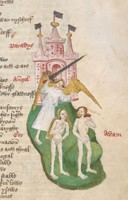 Londra, British Library, Harley 1766, f. 11r. Adamo ed Eva,tentati dal serpente, mangiano il frutto proibito.
