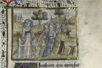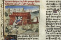 Chantilly, Bibliothèque du Château de Chantilly, 856, f. 116r. Un uomo si avvicina alla lettiga in cui viaggia Poppea, moglie di Nerone, insieme ad altre donne.