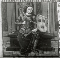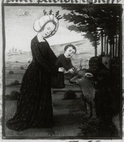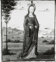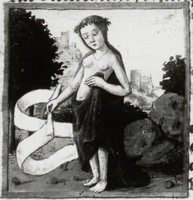 Dresda, Sächsische Landesbibliothek, F 171 b, f. 9r. La vergine Opi, coronata di fiori, regge un filatterio.