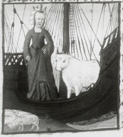 Dresda, Sächsische Landesbibliothek, F 171 b, f. 23v. Medea e Giasone su una nave; ai loro piedi è un piccolo montone che simboleggia il vello d'oro cercato dagli Argonauti.