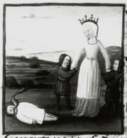 Dresda, Sächsische Landesbibliothek, F 171 b, f. 22v. Isifile, tenendo per mano i suoi due figli, scopre il corpo del piccolo Ofelte soffocato da un serpente.