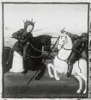 Dresda, Sächsische Landesbibliothek, F 171 b, f. 26r. L'amazzone Orizia disarciona un nemico in battaglia.