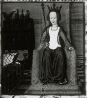 Dresda, Sächsische Landesbibliothek, F 171 b, f. 27r. Medusa seduta sul trono accanto ad un forziere aperto.