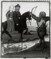 Dresda, Sächsische Landesbibliothek, F 171 b, f. 30r. Ercole, vestito di un'armatura d'oro, scocca una freccia contro il centauro Nesso, il quale è in fuga oltre il fiume dopo aver rapito Deianira.