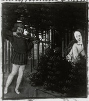 Dresda, Sächsische Landesbibliothek, F 171 b, f. 34r. Procri viene ferita mortalmente da Cefalo nella foresta.
