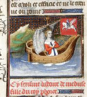 Londra, British Library, Royal 20 C V, f. 33r. Medusa viaggia su una nave su cui è issato uno stendardo raffigurante Perseo in groppa a Bellerofonte (modello mal compreso).
