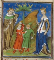 Londra, British Library, Royal 20 C V, f. 34v. Iole, con una ghirlanda tra le mani, siede nel giardino accanto ad Ercole, insieme a due fanciulle che filano.