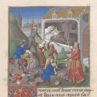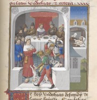 Londra, British Library, Add. 35321, f. 100r. Annone, con le mani mozzate, viene giustiziato dinanzi alla folla.