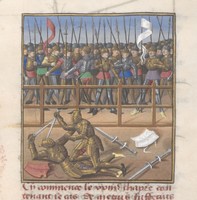 Londra, British Library, Add. 35321, f. 64r. Mezio Fufezio sconfigge Tullo Ostilio, mentre i rispettivi eserciti osservano lo scontro.