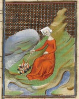 Londra, British Library, Royal 20 C V, f. 45v. L'indovina Manto attizza un fuoco con un bastone.