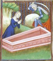Londra, British Library, Royal 20 C V, f. 49v. Neottolemo solleva la spada per uccidere Polissena, la quale è inginocchiata in preghiera sulla tomba di Achille.