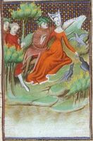 Londra, British Library, Royal 20 C V, f. 75v. Saffo, seduta in cattedra, legge un volume a due uomini e una donna.