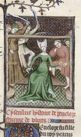 Londra, British Library, Royal 20 C V, f. 58r. Circe siede abbracciata ad Ulisse, sulla sinistra sono due uomini dell'equipaggio e sulla destra due corvi (due uomini trasformati?).