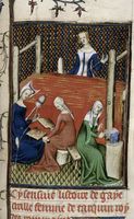 Londra, British Library, Royal 20 C V, f. 75r. Gaia Cirilla lavora al telaio in compagnia di tre donne che filano, tessono e cardano.