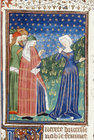 Londra, British Library, Royal 16 G V, f. 66v. Veturia, accompagnata dalla nuora Volumnia con i due giovani nipoti, dissuade il figlio Coriolano dal distruggere Roma.