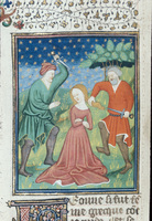 Londra, British Library, Royal 16 G V, f. 76v. Virginia viene assalita da un gruppo di uomini nel tempio della Pudicizia.