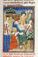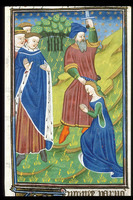 Londra, British Library, Royal 16 G V, f. 62r. Atalia, regina di Gerusalemme, ordina il massacro di tutti i discendenti maschi della stirpe di David; Atalia viene lapidata.