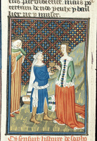 Londra, British Library, Royal 16 G V, f. 66r. Il padre di Megulia Dotata versa la dote per la figlia al padre dello sposo.
