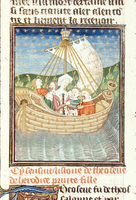 Londra, British Library, Royal 16 G V, f. 65r. Ippona si getta in mare dalla nave per sfuggire ai suoi rapitori.