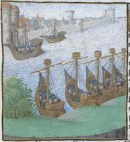 Parigi, Bibliothèque Nationale de France, Vélins 1223, f. s5r. Incunabolo miniato stampato a Parigi da Antoine Vérard il 26/04/1493. Un attacco navale in Sicilia.