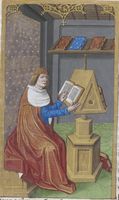 Parigi, Bibliothèque Nationale de France, Vélins 1223, f. t5r. Incunabolo miniato stampato a Parigi da Antoine Vérard il 26/04/1493. L'autore Giovanni Boccaccio allo scrittoio.