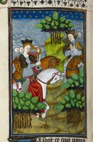 Londra, British Library, Royal 16 G V, f. 94v. Le mogli dei Cimbri vengono impiccate accanto ai corpi dei loro mariti.