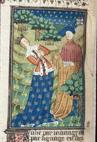 Londra, British Library, Royal 16 G V, f. 93r. Sempronia viene corteggiata da un uomo; accanto ai due si trovano un altro personaggio maschile e un tavolo su cui sono poggiati degli strumenti musicali ed un libro.