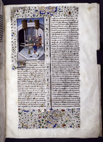 New York, Public Library, Spencer 33, f. 33r. Leonzio nel suo studio sfoglia un libro su un leggio; sullo sfondo, due cortigiane incontrano dei clienti.