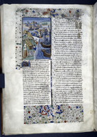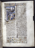 New York, Public Library, Spencer 33, f. 31v. Artemisia fa erigere un monumento funebre in onore del defunto marito; Artemisia guida l'esercito contro i soldati di Rodi che stanno sbarcando ad Alicarnasso.