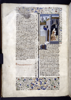 New York, Public Library, Spencer 33, f. 28r. Atalia, regina di Gerusalemme, ordina il massacro di tutti i discendenti maschi della stirpe di David; Ioas viene incoronato re di Giuda da due vescovi; tre cittadini osservano il corpo di Atalia venire trascinato per i capelli fuori dai cancelli della città.