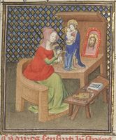 Parigi, Bibliothèque Nationale de France, Fr. 12420, f. 92v. Irene dipinge la statua di una Madonna con bambino.