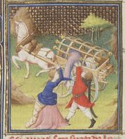 Parigi, Bibliothèque Nationale de France, Fr. 12420, f. 110r. Beronice insegue gli assassini del figlio su un carro da guerra.
