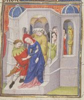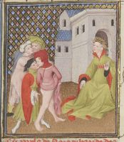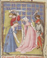 Parigi, Bibliothèque Nationale de France, Fr. 12420, f. 103v. Armonia assiste all'uccisione della giovane schiava che ha preso il suo posto, quindi si consegna ai sicari mandati per ucciderla.