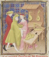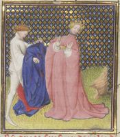 Parigi, Bibliothèque Nationale de France, Fr. 12420, f. 93r. Leonzio, dinanzi ad un leggio, è corteggiata da un ammiratore.
