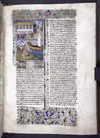 New York, Public Library, Spencer 33, f. 66v. Semiamira si prostituisce; Semiamira appare in Senato al fianco del figlio, l'imperatore Antonio (Eliogabalo); Semiamira presiede il senaculum, rappresentato da tre matrone romane; Semiamira ed Antonio vengono assassinati da due uomini.
