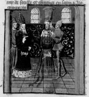 Parigi, Bibliothèque Nationale de France, Fr. 230, f. 257v. Il copista del manoscritto è P. Droulin. Isacco II Angelo viene condotto prigioniero dinanzi al fratello, Alessio Angelo.