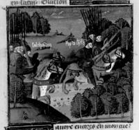 Parigi, Bibliothèque Nationale de France, Fr. 230, f. 268r. Il copista del manoscritto è P. Droulin. Gualtieri di Brienne, duca d'Atene, viene ucciso nella battaglia di Poitiers.