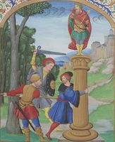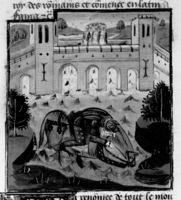 Parigi, Bibliothèque Nationale de France, Fr. 230, f. 265v. Il copista del manoscritto è P. Droulin. I filosofi Teodoro e Anassarco vengono torturati per ordine dei tiranni Geronimo e Nicocreonte; Muzio Scevola mette la mano nel fuoco al cospetto di Porsenna.