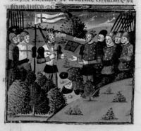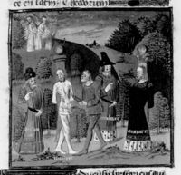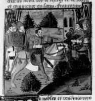 Parigi, Bibliothèque Nationale de France, Fr. 230, f. 273r. Il copista del manoscritto è P. Droulin. Giovanni il Buono si arrende a Odoardo III nella battaglia di Poitiers.